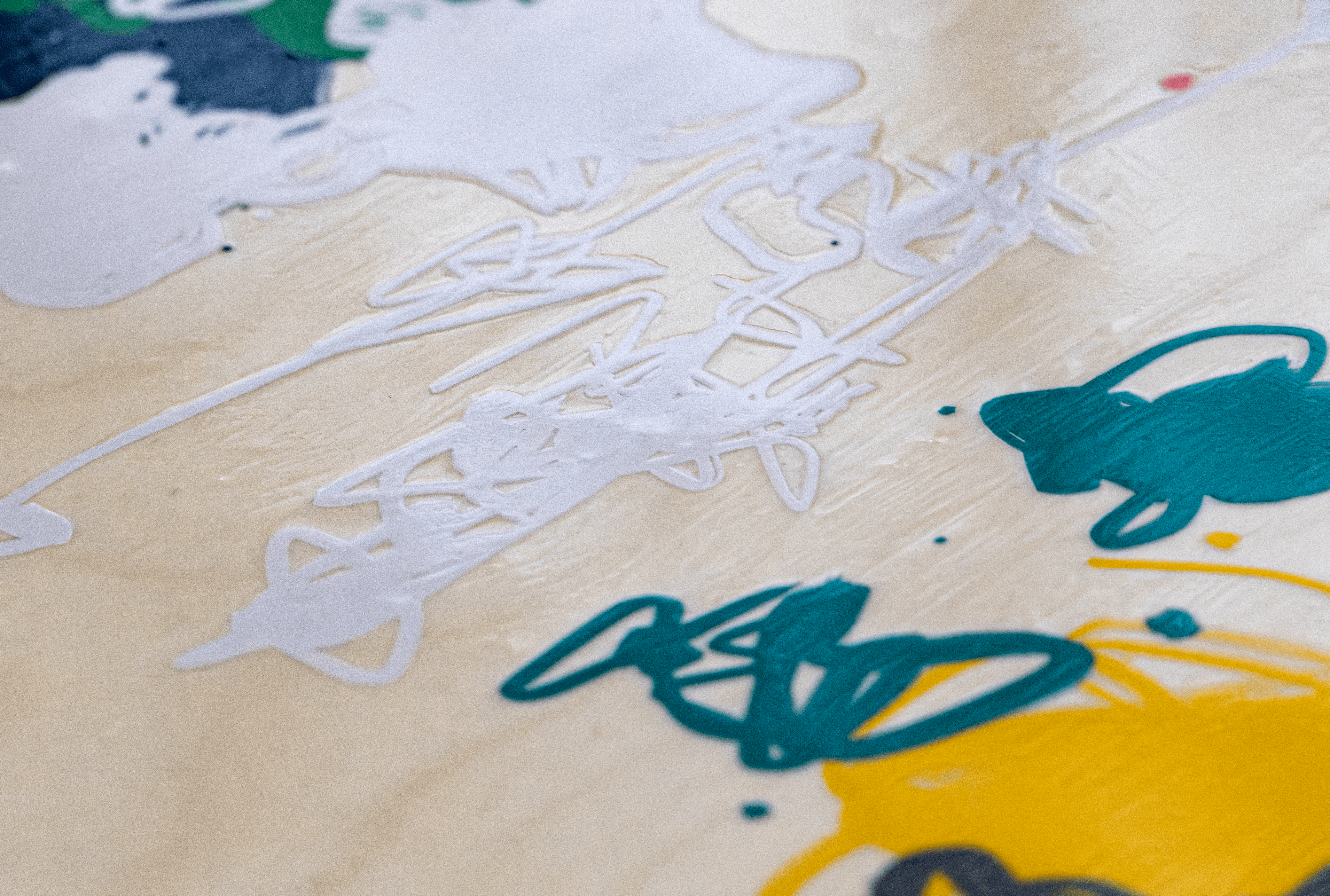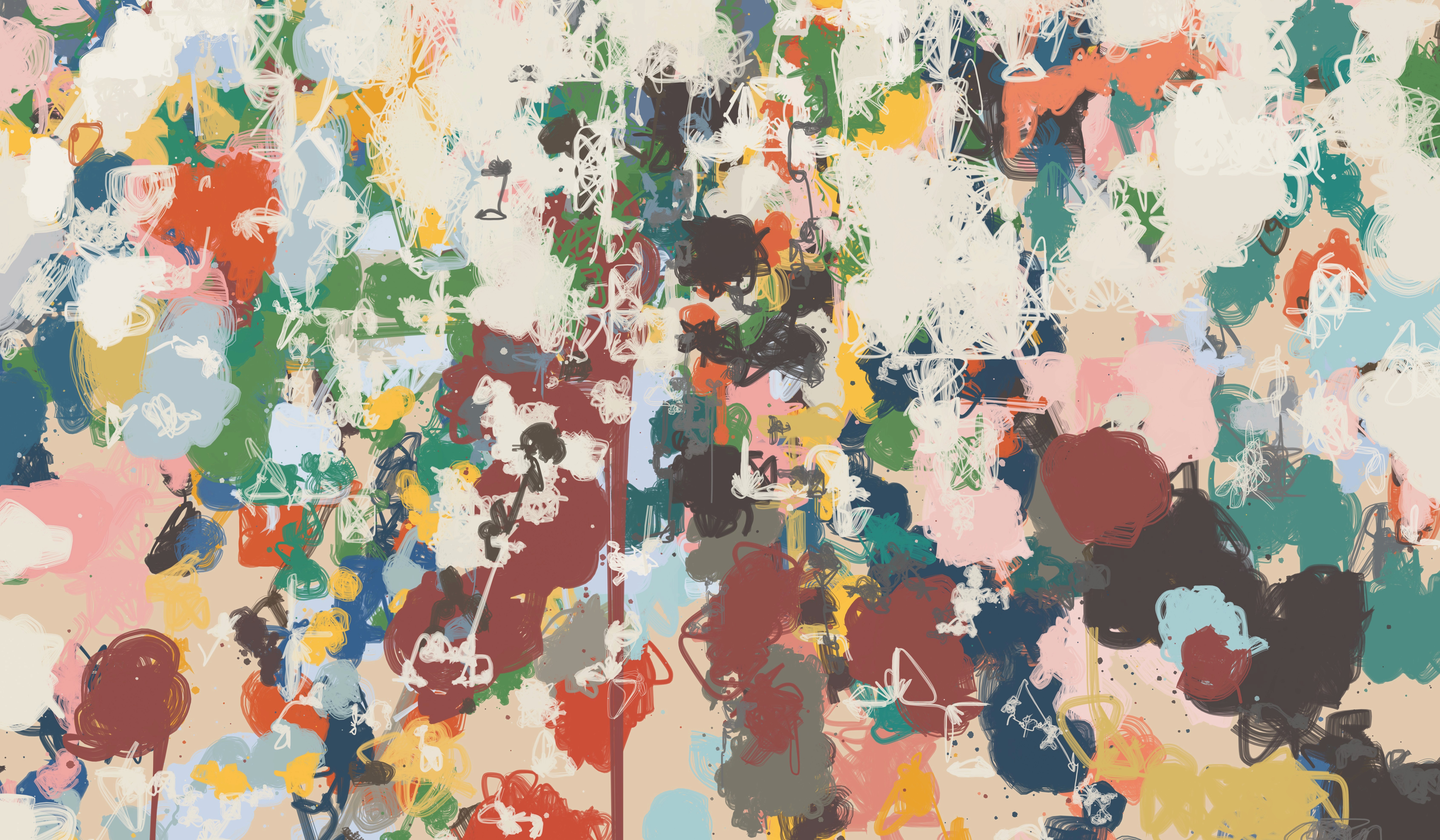 This work was inspired not only by the work of Mitchell and Twombly, but also by the density and chaos of urban graffiti and sticker spots in Madrid. In those locations where scores of tags or hundreds of stickers compete for the same small piece of real estate, the aesthetic can somehow transcend its early state of noise and disorder, unexpectedly reaching a state of complex harmony. The lack of overall design seems to promote a type of anarchistic equality, with all of the different visual elements similarly jostling for attention. Each mark had its color chosen independently from the rest, without consideration for potential clashes. And yet, as the clashes stack up, their individual importance eventually dissolves away. To stand out is to fit in.